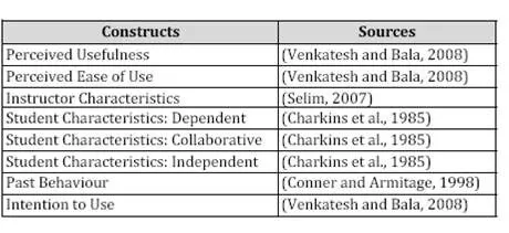 The constructs in this study were adapted from a well-known model, TAM, and previous researches. The proposed model assumed that the dependent variable (Intention to Use) is affected by independent variables that are perceived usefulness, perceived ease of use, instructor characteristics, different types of student characteristics (Dependent/ Collaborative/ Independent), and past behaviour. Table 1 shows literature sources of each construct.