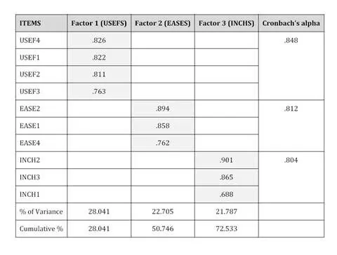 The survey instruments were tested to assess their construct reliability and validity. Cronbach’s alpha of each construct was assessed. EASE3 and INCH4 were deleted. Internal consistency of all factors are high since all Cronbach’s alphas are greater than 0.8. Cronbach’s alpha of INTU1-INTU3 is 0.794. Factor analysis were applied to check convergence validity (factor loadings are greater than 0.5) and discriminant validity (items were loaded with the right factor) and to form constructs from survey items. Principal axis factoring method with varimax rotation was applied. Three factors with eigenvalues more than 1 were derived. All factors can explain 72.533 percent of the cumulative variance of ten items as shown in Table 2.