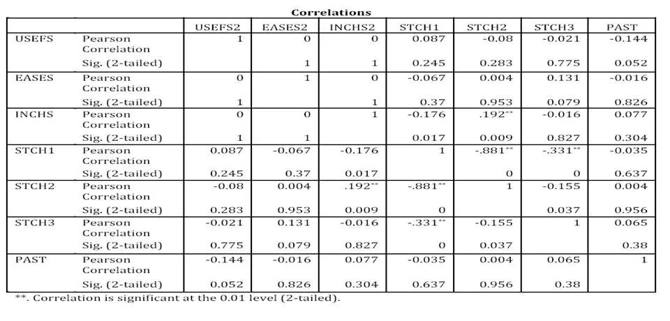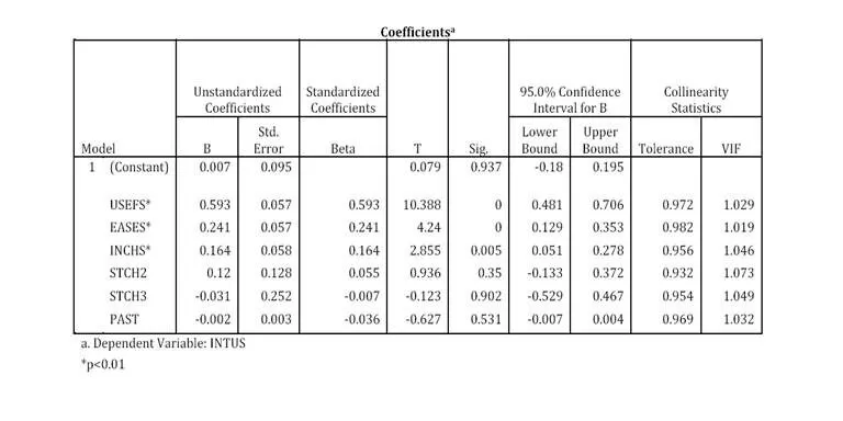 Relationships between six predictors (PAST, STCH2, EASES, USEFS, INCHS, STCH3) and a dependent variable (INTUS) are then explored by multiple regressions (enter method). The multiple correlation coefficient “R” for six predictors as shown in Table 4 represents the combined correlation of these predictors with the dependent variable (R = .667). The adjusted R square (R2 = .426) indicates that 42.6 percent of the variations in the Intention to Use can be explained by combined adoption factors.