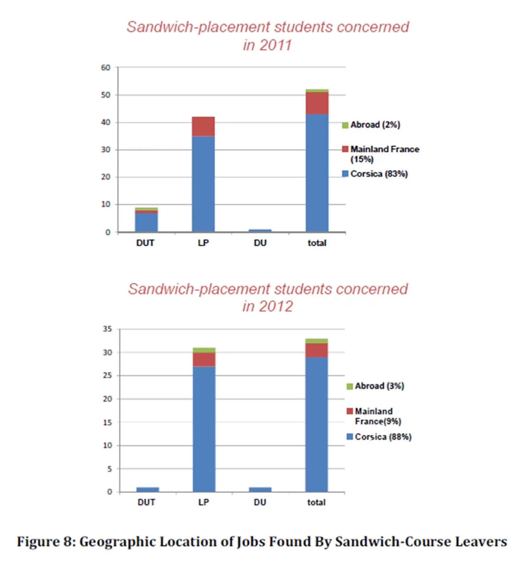 With commentators touting the knowledge economy as the only way out from endemic economic crisis, the University Institute of Technology Corsica has taken a pro-active role by engaging in a process to structure a consolidated, sustainable socio-economic fabric though optimized management of its vocational training/information, guidance services and tailored careers support system. The faculty, thus works in close collaboration with the CFA UNIV, which leaders the annual survey 10 specifically geared to sandwich-placement students (monitoring school-to-work transition figures for sandwich-course leavers (graduated or not) in March the following year).