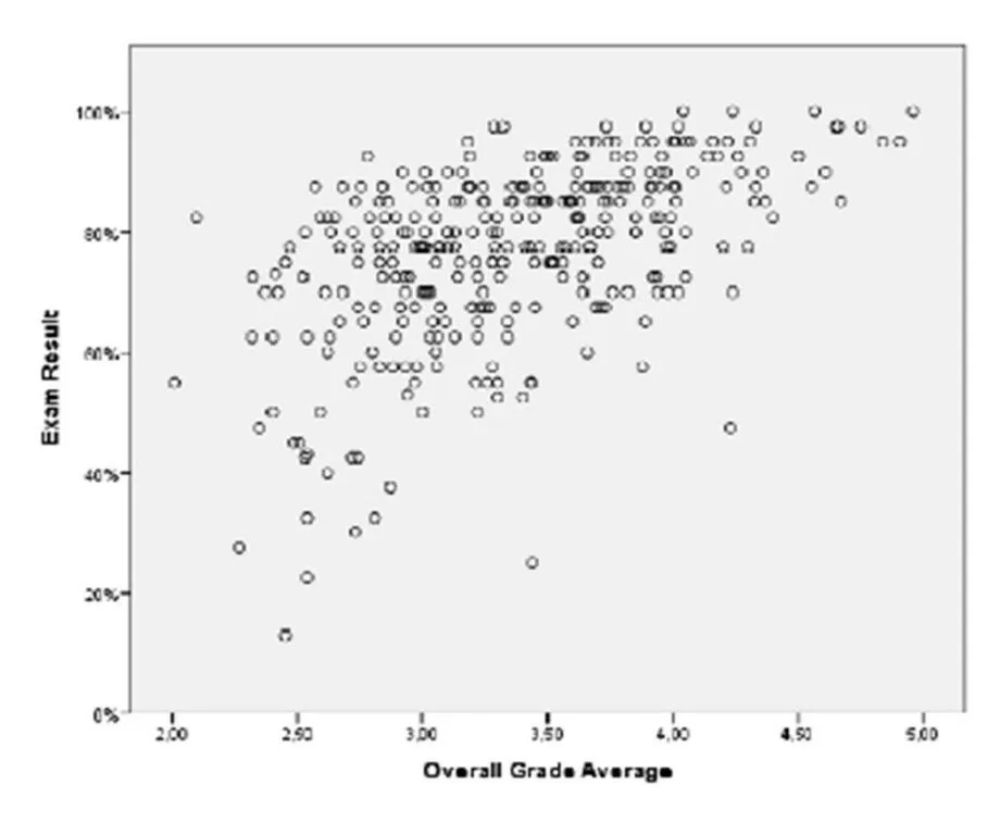 Figures 1-3 (below) show scatter plots of students’ language proficiencies, lecture attendances and overall grade averages; respectively, versus their exam results. The scatter plots suggest weak, positive correlations between language proficiencies and exam results and also between lecture attendances and exam results. The scatter plot in Figure 3 indicates a moderate, positive correlation between students’ overall grade averages and exam results.