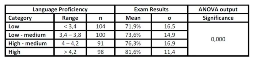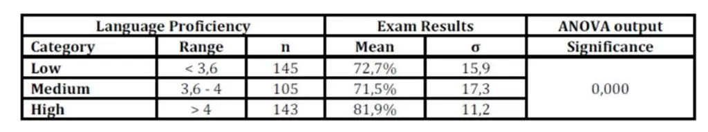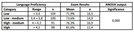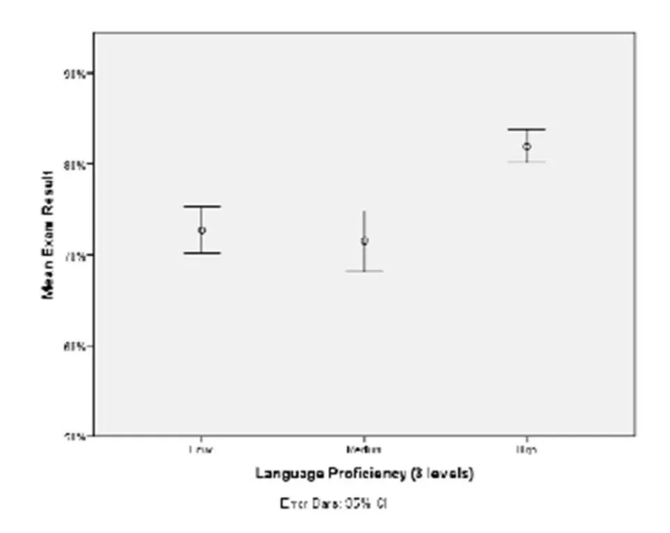 Table 3: Comparison of Mean Exam Results for 3 levels of Language Proficiency