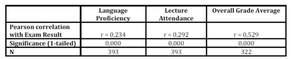 While lecture attendance explains a smaller proportion of the variance (approximately 2,4%) in the exam result, the overall grade average variable accounts for a far greater proportion of the variance in the dependent variable (approximately 19%) than either language proficiency or lecture attendance. Conclusion