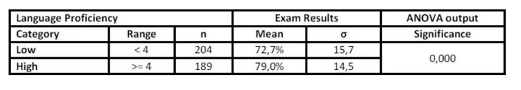 Table 2: Comparison of Mean Exam Results for 2 levels of Language Proficiency