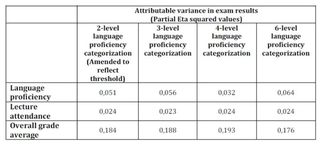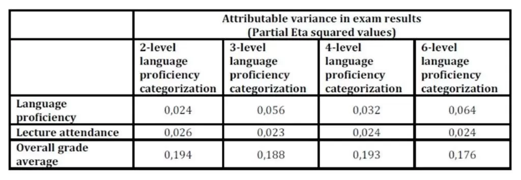 Thus, the proportion of variance in exam results attributable to language proficiency is shown to lie between 3,2% (for the 4-level categorization) and 6,4% (for the 6-level categorization). Arguably, the most accurate estimate of the effect is provided by the partial eta squared value for the corrected 2-level language proficiency categorization, i.e. 5,1%. In all cases, the effect of language proficiency remains significant (at the 0,05 significance level) when lecture attendance and overall grade average are controlled for.