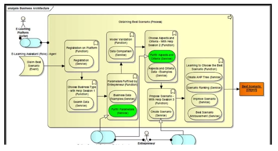 B. The business architecture. Business Architecture (BA) describes the strategic elements of an organization, the organizational, functional and informational attributes, principles, processes and business functions. BA is a valuable tool in analyzing the current state of business, in setting the required changes and in selecting appropriate tools and techniques for optimal decisions. Business architecture of e-learning platform in entrepreneurship includes actors, roles, processes, functions, events, services and products (figure 1). BA describes how a student can use the e-Learning to acquire skills for developing and evaluation of a business scenario and also for the optimization of a scenario already defined. As a solution to simulate the specific activities, a multi-agent system is chosen.