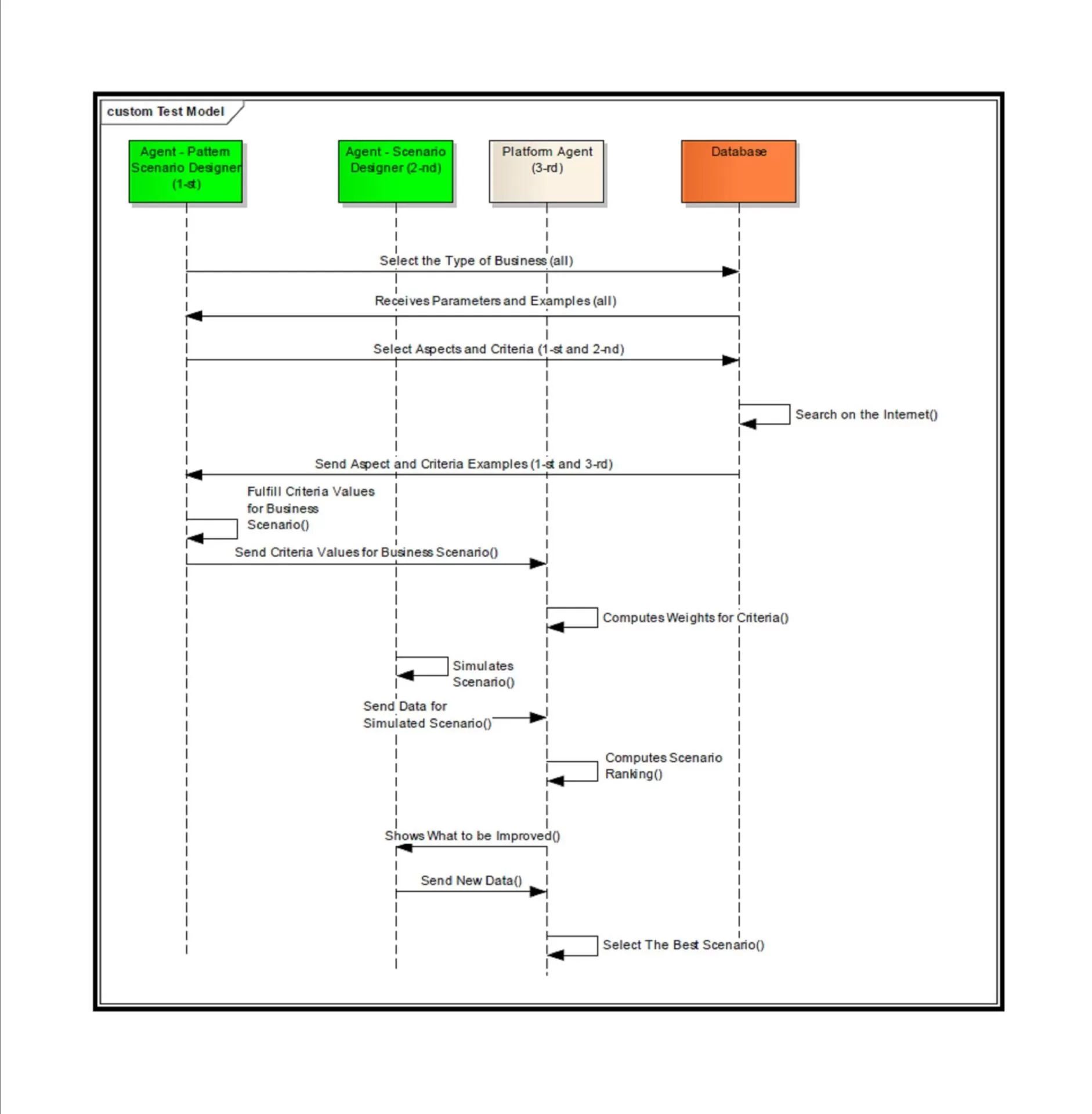 The sequence diagram for the e-learning platform is presented in figure 7. As we can see, the diagram describes the sequence of the messages sent by agents for different learning paths. Let us suppose that A-PSD (1-st) / A-SD (2-nd) want to create their own template by selecting the type of business and the domain from the database. A-P (3-rd) retrieves the requested information from the database and sends it to A-PSD / A-SD agent. After the A-PSD agent builds a valid business scenario, the A-P agent calculates the criteria weights. A-SD fills the criteria values and sends the scenario to A-P. The A-P agent calculates the score of each scenario and sends a message to A-SD indicating which criterion can be improved. After several successive rounds, the best scenario can be identified.