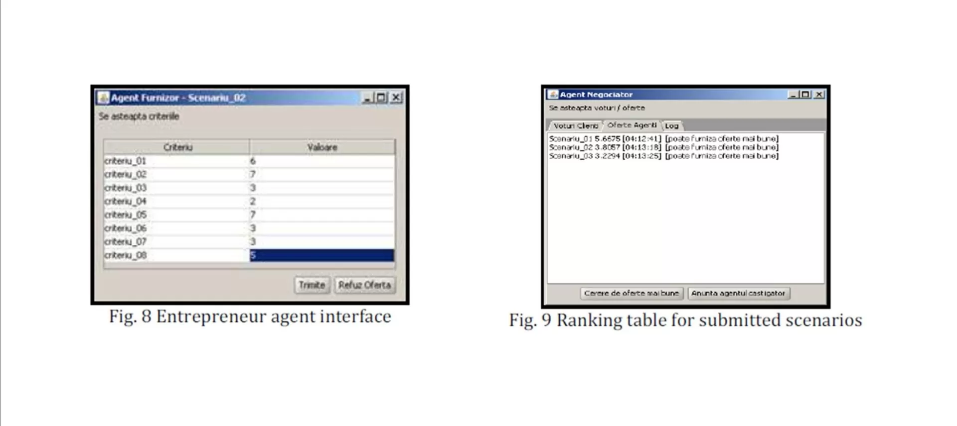 – An agent-based simulation (ABS) component, which develops business scenarios, based on decision alternatives about the product/service, start-up and marketing strategies. The students introduce the main parameters required for these scenarios. In order to be domain-independent, the parameters are generic, such as: business type, aspects and criteria. Using these parameters, the ABS component develops different scenarios and will simulate a negotiation process in order to identify the best business scenario. The students have access to the results of every negotiation phase, in order to learn how different business scenarios can be assessed.