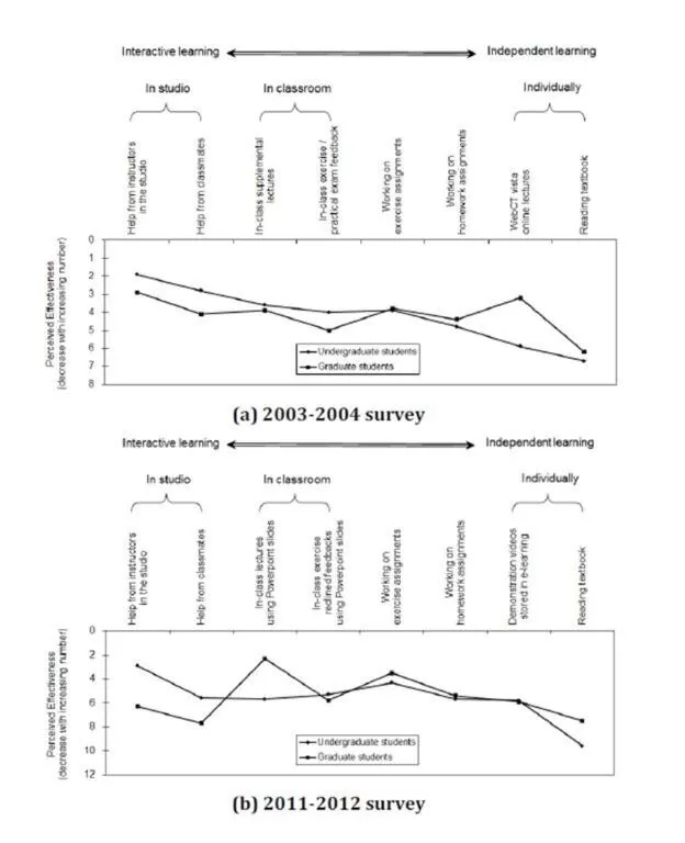 In the 2011 and 2012 surveys, the three learning vehicles (online lectures, help from instructors, and help from classmates) that had a significant difference in the 2003 and 2004 surveys were also ranked similarly (Table 4). However, the mean ranking differences were greater in the 2011 and 2012 surveys than in the previous investigation. While the help from instructors in the studio and from classmates in the 2003 and 2004 surveys showed 1.0 and 1.2 ranking differences between undergraduate and graduate students, respectively, the mean ranking differences of the same learning vehicles were 3.4 and 2.1 in the 2011 and 2012 surveys (p<0.01). This means that the undergraduate students in 2011 and 2012 were more likely to rely on help from instructors or classmates rather than individual or independent learning. Further, the in-class Powerpoint lectures assessed in the 2011 and 2012 surveys and the Web CT online lectures in the 2003 and 2004 surveys were more preferred by graduates than undergraduates.