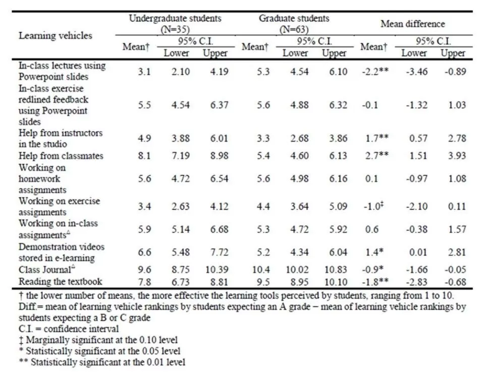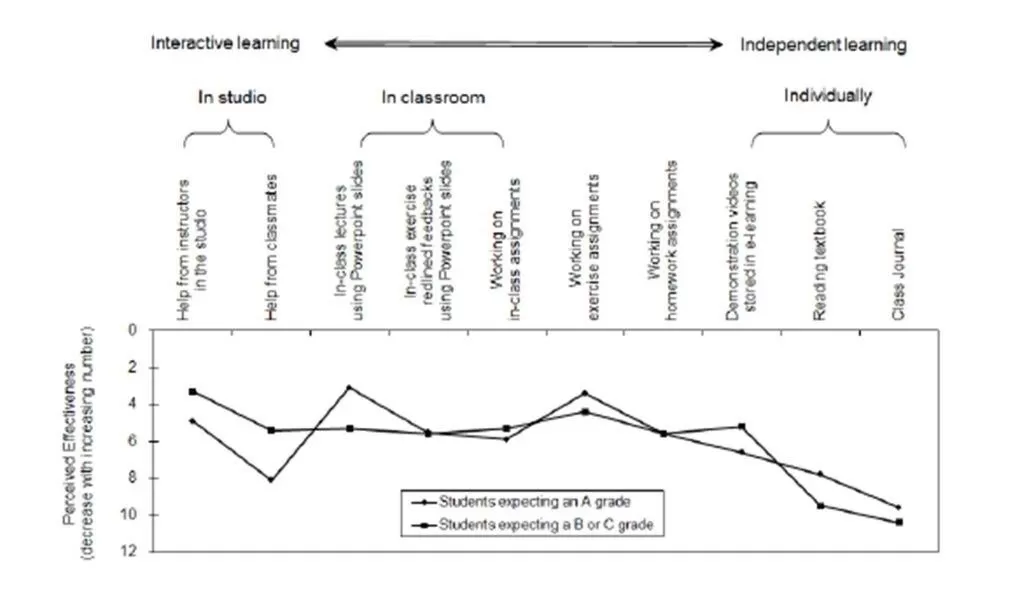 Table 5 and Figure 2 represent the results of learning preferences between students expecting an A grade and those expecting a B or C grade. Students who expected an A grade were more adaptive to individual learning such as the class journal (p<0.05) and reading the textbook (p<0.01) than those expecting a B or C grade, and were more likely to understand the course subjects by working on exercise assignments independently. The results also show that in-class lectures using Powerpoint slides were more helpful to students expecting an A grade than the group of students expecting a B or C grade. However, students who expected lower grades tended to prefer more interactive learning methods such as getting help from instructors in the studio or getting help from classmates. Interestingly, pre-recorded demonstration videos that show grading processes stored in e-learning were more efficient for students expecting a B or C grade (p<0.05).