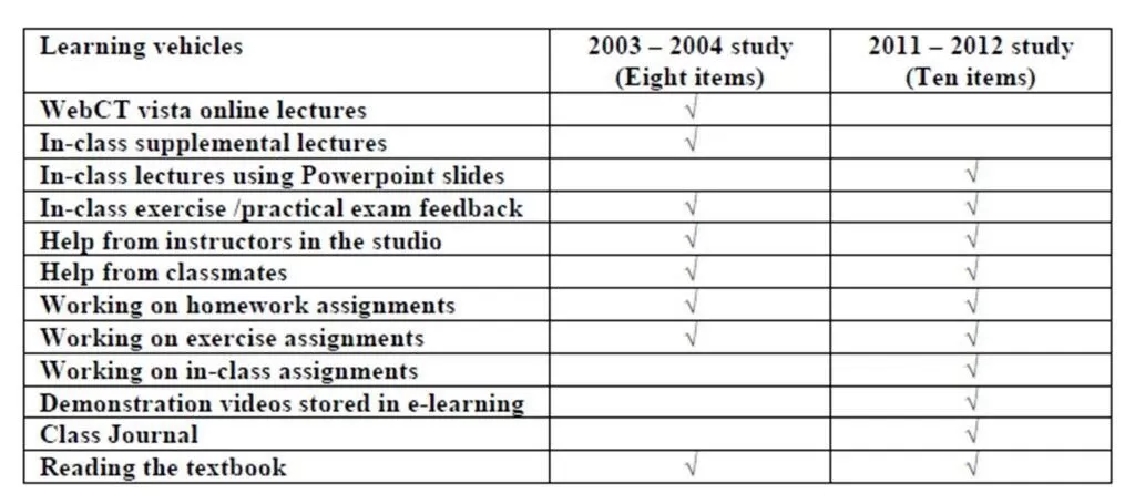 The researchers conducted a longitudinal comparison on two investigations that were eight years apart (the first one in 2003-04 and the second in 2011-2012) with the following specific purposes: 1) evaluation of students’ learning satisfaction and the effectiveness of e-learning in landscape architecture construction studio courses, 2) comparison of trends in learning vehicles preferred by graduate and undergraduate students, and 3) examination of preferred learning vehicles between students expecting an A grade and those expecting a B or C grade.