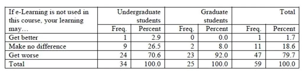 In the second survey conducted in 2011 and 2012, a new question was added to assess learning effectiveness of web-enhanced teaching. Table 2 presents the results of learning effectiveness of both undergraduates and graduates. More graduate students reported that e-learning provided a positive influence on their learning experience than undergraduate students (92.0% for graduates vs. 70.6% for undergraduates). In contrast, more undergraduates responded that their learning would not be changed even if e-learning was not utilized (26.5% for undergraduates vs. 8.0% for graduates).
