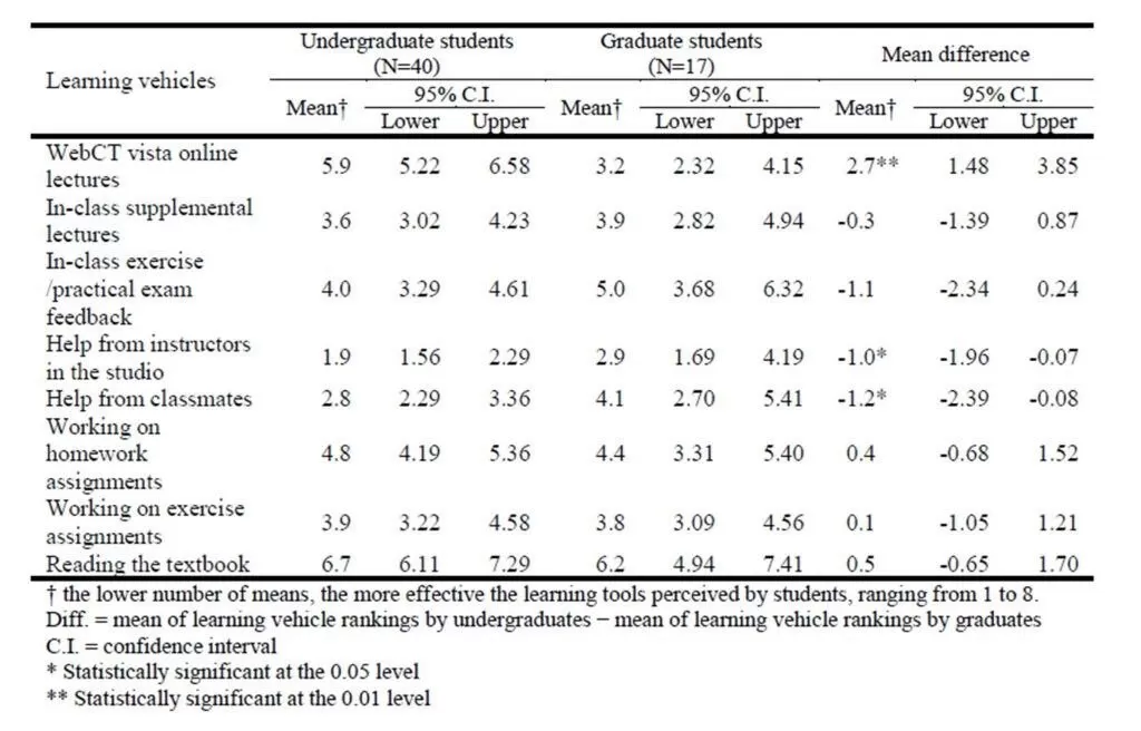 Table 3 shows the results of perceived learning vehicle preferences and the mean differences between undergraduate and graduate students in the 2003 and 2004 surveys. WebCT vista online lectures as one of the web-enhanced teaching methods was highly preferred by graduate students, compared to undergraduate students (a higher ranking of 2.7 by graduate students, p < 0.01). However, undergraduate students preferred help from instructors in the studio or from classmates. The mean difference of the ranking in preferred learning vehicles between the two groups was statistically significant at the 0.05 level (a higher ranking of 1.2 for help from instructors, and a higher ranking of 1.0 for help from classmates by undergraduate students). The other five items for the learning vehicles did not show statistically significant relationships between two groups.