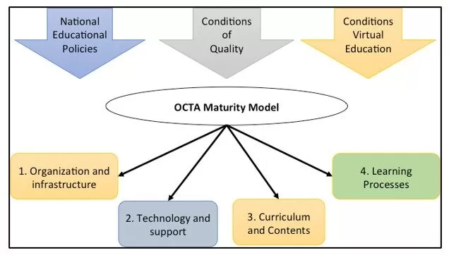 In this sense, education with the virtual methodology is characterized by a set of factors associated with learning processes, management processes, organizational processes and support and follow-up processes. These factors indicate and establish guidelines to evaluate all their contexts and performance, allowing to create a maturity model defined as OCTA (Organization, Content, Technology and Learning), and interacting as a system.