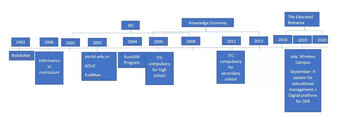The interest for the modernization of the educational system started with the fall of communism, once a profound reconstruction was initiated (Popescu, 2010). Reforms were needed on different levels (Popescu, 2010): providing the lacking ICT infrastructure, creating an environment that assured the development of minimal digital skills and technologizing the educational processes (Marga, 2002). Although some private initiatives were conducted before 1996, the real decentralization of the education system began in 1997 with Professor Andrei Marga as the Minister of National Education (Popescu, 2010). Throughout the years, all the other ministers continued his effort by adding additional changes to the Law of National Education in accordance with the guidelines of the European Union. Moreover, the private sector did not remain impassible, as well as active communities that have been formed over the years to provide modalities of informal acquisition of skills and abilities needed in a modern education system (Grosseck, et al., 2019).