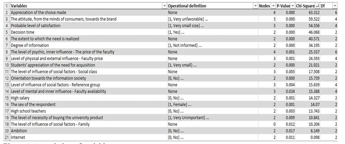 As can be seen in figure 1, after analyzing all the variables used in the model (46 variables), a series of 20 variables were generated showing an association with the decision variable. The figure reports in descending order, having as a reference element the chi-square association coefficient, the degree of relationship between the variable used as the center of the decision and the strongest influences on it.