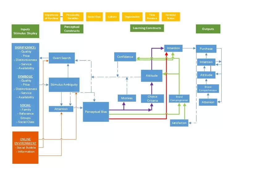 Prasad and Jha (2014) and Kurunathan and Shanmugathas (2017) describe the Howard-Sheth model as a model that sums up the learning of consumer attitudes and perceptions as a result of the application of stimuli. At the same time, the model, as noted by Kalpana and Shibu (2016, pp. 387-388), calls into question the decision-making process in the circumstance of lack of information about the product. In the same way, I can add, to those mentioned above (Kalpana and Shibu, 2016), according to the model, the other two situations in which the decision maker may be, namely having sufficient or partial information about the product.