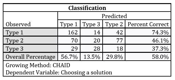 In order to test hypothesis 2, I created, with the help of the analysis in SPSS, a decision table for all types of decision makers. The analysis contained all 46 variables, which were reduced to a number of 4 variables, which shows the highest probability of choice for the types of decision makers. According to the analysis, a series of 11 nodes were generated, which contain the variables with maximum probability of winning for each type of decision maker.