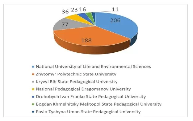557 students of different degrees (bachelor’s, master’s, postgraduate) responded to the questionnaire. They represented 7 Ukrainian higher education institutions: National University of Life and Environmental Sciences (206), Zhytomyr Polytechnic State University (188), Kryvyi Rih State Pedagogical University (77), National Pedagogical University named after MP Drahomanov (36), Drohobych State Pedagogical University named after Ivan Franko (23), Melitopol State Pedagogical University named after Bohdan Khmelnytsky (16), and Uman State Pavel Tychyna Pedagogical University (11) (see Figure 1).