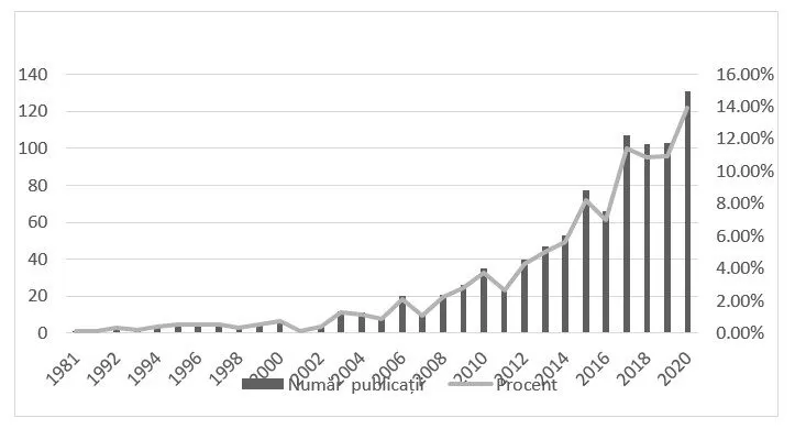 The first step in the bibliometric research is the search of the key notions that are the central part of the analysis, namely „start-up*” and „business performance”. The search was finalized between January-February 2021 and it used the „Article title” search criteria on the Web of Science database which returned a total number of 940 publications over the 40 years period chosen for the analysis, specifically between 1981 and 2020. Publications from 2021 were removed from this analysis and considered irrelevant due to the fact that the year 2021 is incomplete.