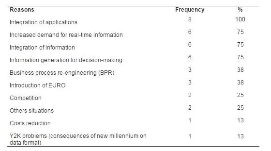 According to Botta-Genoulaz and Millet (2006) “Government organizations are increasing the adoption of ERP systems for various benefits such as integrated real-time information, better administration, and result-based management”(p.211). When asked about the main reasons for implementing the ERP system, almost all the respondents answered: the integration of applications, the increased demand for real-time information, the integration of information and the Information generation for decision-making. The other reasons that lead public organizations to implement the ERP system can be observed in table1.