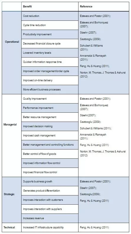 Many studies have been conducted on ERP benefits (Esteves and Pastor, 2001; Esteves and Borhorquez, 2007), yet low awareness of the benefits of an end-to-end system has been acknowledged as the biggest problem (Esteves, 2009).Many organizations have not fully realized the potential benefits from ERP systems (Feng, Hu & Huang, 2011).Regardless of the size, sector or scale of business, the awareness of the benefits of an enterprise solution is very critical. Many research findings continue to recognize the fact that organizations do not always realize the benefits they wish to achieve when pursuing ERP implementation (Schubert & Williams, 2011).