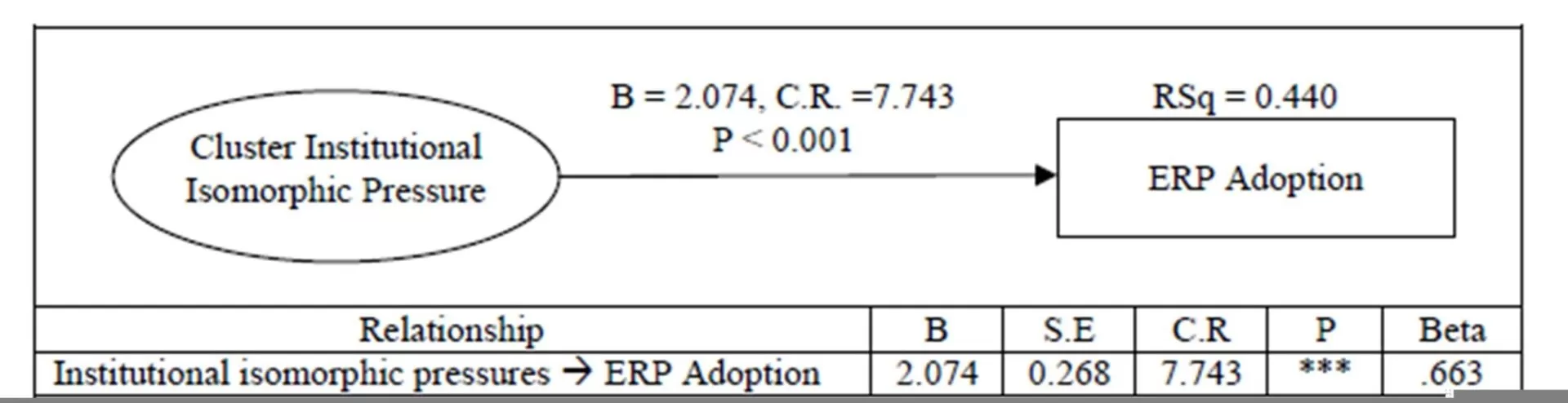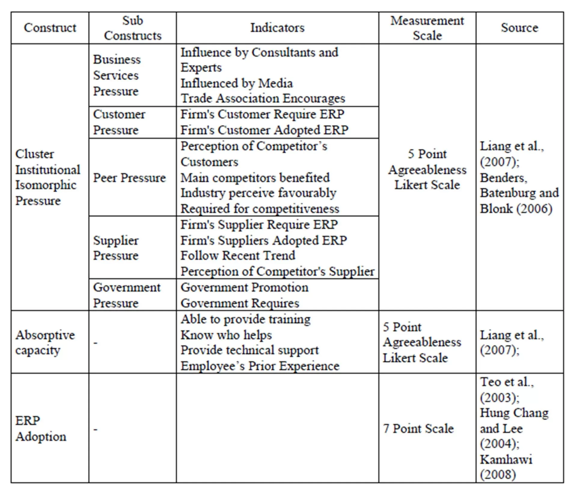 From the review of literature, looking at the institutional structure, we understand that the industrial cluster can produce an isomorphic pressure on firms to be homogeneous. This isomorphic pressure is understood to force organizations to adopt a common innovative technology such as ERP. Recursively it can also be seen as the adoption of a common technology like ERP and isomorphic forces that produce homogeneity in turn helps the formation of the cluster. DiMaggio and Powell’s (1983) identified three dimensions of institutional isomorphic pressures namely, coercive, mimetic and normative pressure.
