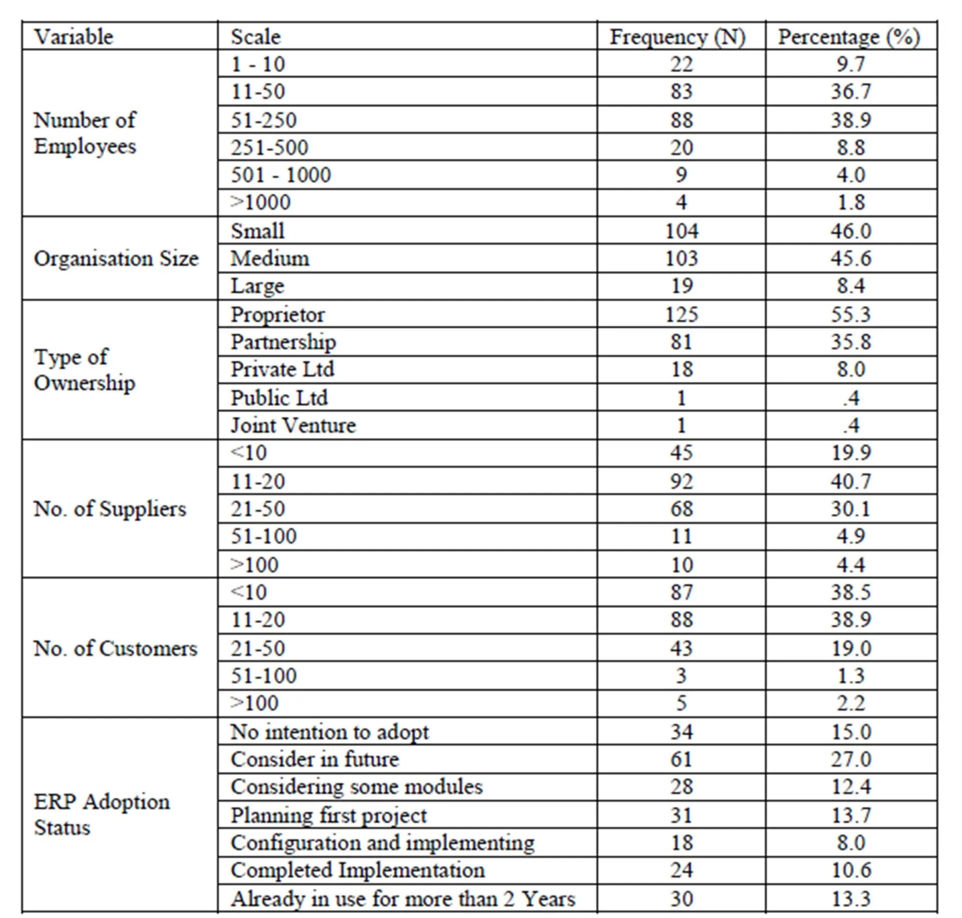 The characteristics of the organisations in a cluster and particularly SMEs are an important factor of ERP adoption. Extant of literature have found organisational size as significant factor in ERP adoption (Liang, Saraf, Hu, & Xue, 2007; Pan & Jang, 2008; Teo, Wei & Bengasat, 2003). Buonanno et al., (2005) studied the influence of business complexity on ERP adoption, a composed factor of the organisational characteristics such as company size, the market area, part of an industrial group, having branch offices or units, and the degree of functional and process extension. To control the differences among the organisations of the cluster, the variables found in Buonanno et al.’s study are used as control variables.