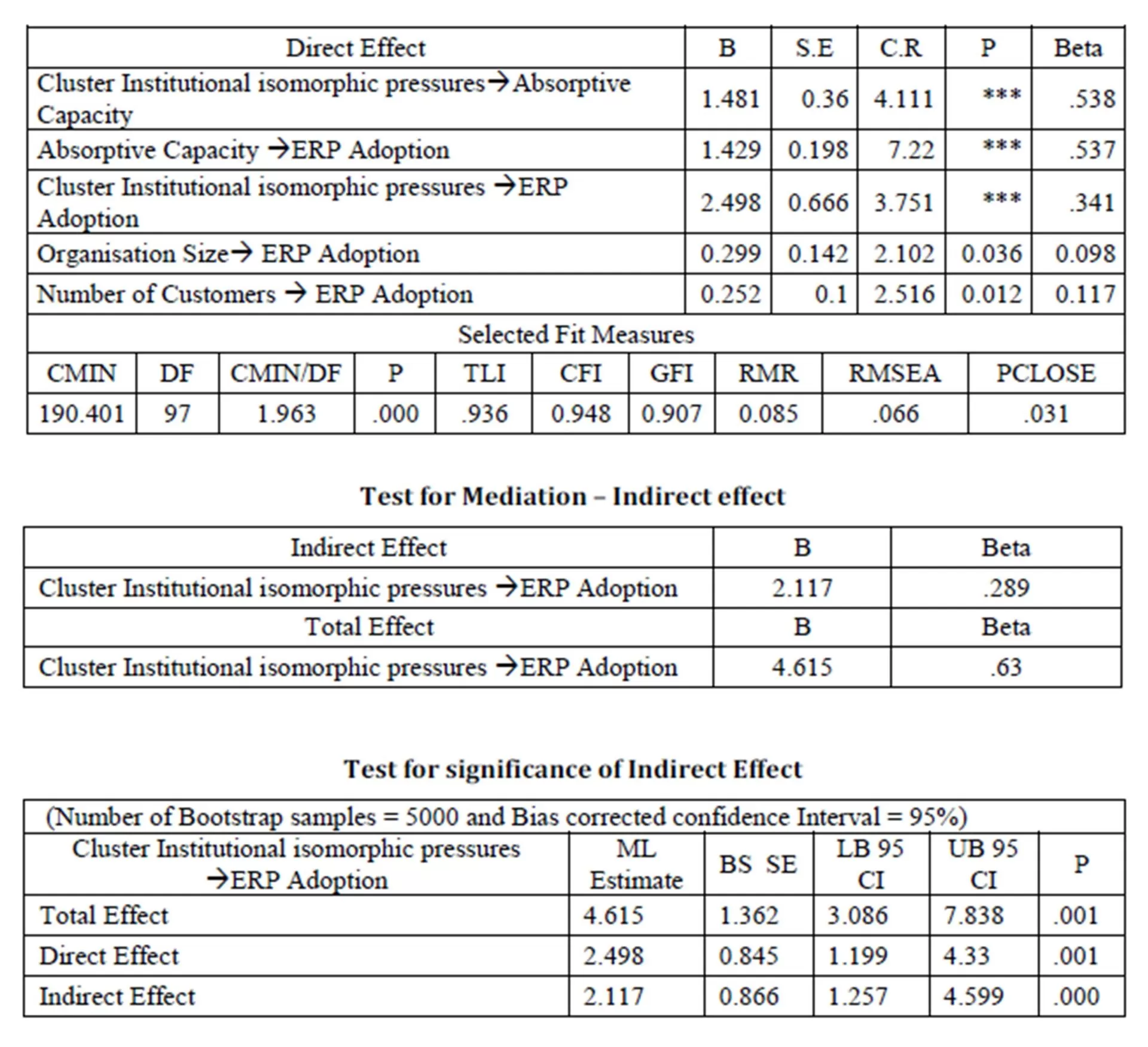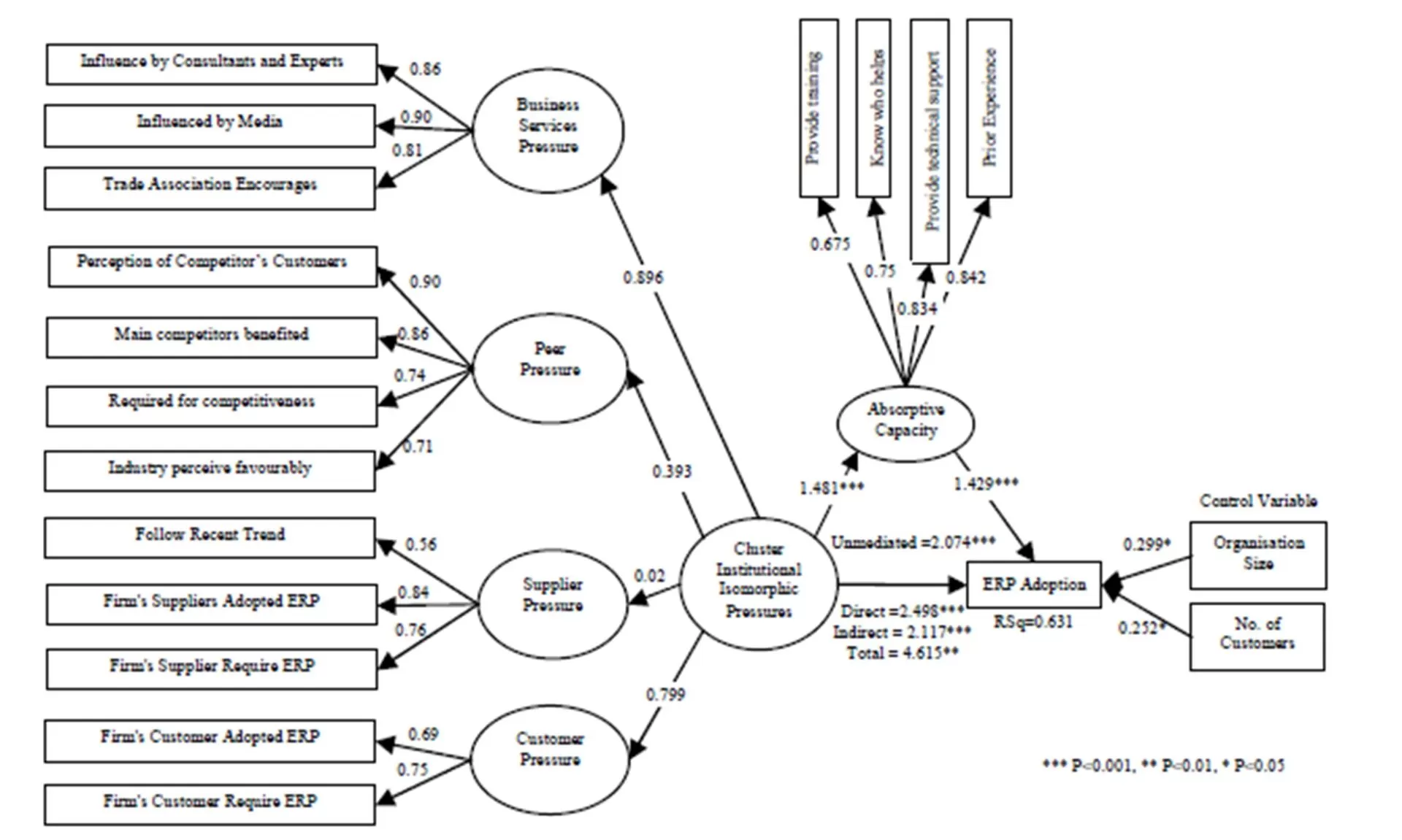 The readiness to adopt ERP can also be understood to have been created by the isomorphism. The study shows that the Cluster Institutional isomorphism positively influences the absorptive capacity. The close network of the manufacturing firms and the other supporting firms in the cluster can be attributed to the positive absorptive capacity. The results of the mediation analysis clearly indicate that the absorptive capacity actually mediates the Cluster Institutional isomorphic pressure towards the ERP adoption. Our finding is supported by the similar finding of Nevo et al., (2007), that firms see tangible benefits from using external IT consultants only when the level of existing internal IT capabilities support. From the various types of mediation effects discussed by Zhao et al., (2010), the outcome of this study can be understood to be a complementary mediation, because, in addition to the positive and significant indirect influence of isomorphic pressure, the relationship between the Isomorphic pressure, absorptive capacity and ERP adoption are all found to be positive and significant.
