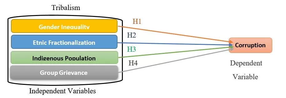 However, social science in general and the management field, in particular, have been Slow-moving to conduct meaningful research in the area of tribalism and corruption that explains why tribalism causes corruption. Tribalism and corruption issues have hardly been addressed in most of the management’s top journals. Hence, it is critical for the management field to become involved in scholarships that may help academics and practitioners to better comprehend the many aspects of tribalism and a country-level of corruption. That leads to one research question; why does tribalism cause corruption? This study fills the gap in the literature by answering the above-mentioned question through empirically examining the relationship between the critical factors (i.e., indicators/components) of tribalism (i.e., the perceptions of gender inequality, perceptions of grievance, linguistic and ethnic fractionalization) and corruption (Figure1). The findings of this study could also benefit educators and policymakers to understand the dynamics of tribalism and focus on tailoring specific educational programs and policies that help reduce corruption.