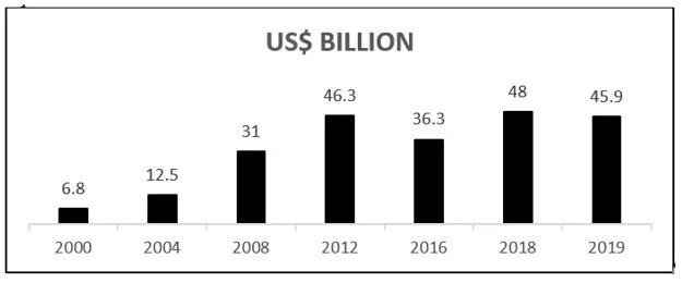 Figure 1: The year 2019, the third-best historica performance of Peruvian Exports (billions of dollars)