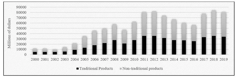Figure2: Peru, Evolution of non-traditional exports (2000-2019) (million dollars)