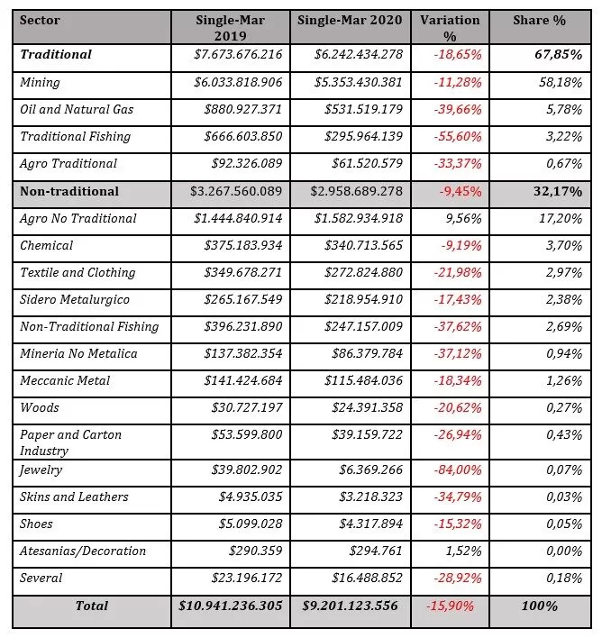 In the first quarter of 2020, and according to data from the Lima Chamber of Commerce, Peruvian exports totaled US$ 9,201 million, with a decrease of 15.9% from the same period last year. Within the traditional macro sector (which was down 18.65%), the most affected sector was the traditional sector, whose exports decreased by 55.60%; followed by oil and natural gas, with a drop of 39.66%. For its part, the macro non-traditional sector had a negative variation of 9.45%, in which the most affected sector was the jewelry sector, which had a decrease of 84%; followed by non-traditional fishing, 37.62%.