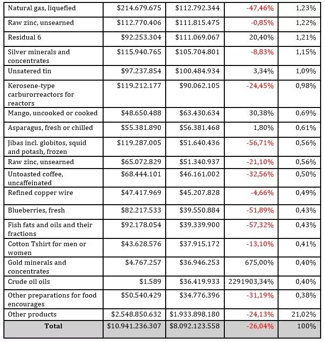 The main non-traditional products that reached an export record in 2019 are grapes (8%), blueberries (51%), battered (4%), frozen raw pot (65%), fresh mangoes (1.5%), frozen precocidal pot (5.5%), silver aleada (200%), mandarin (128%), ethyl alcohol (80%) and prawns (54%).