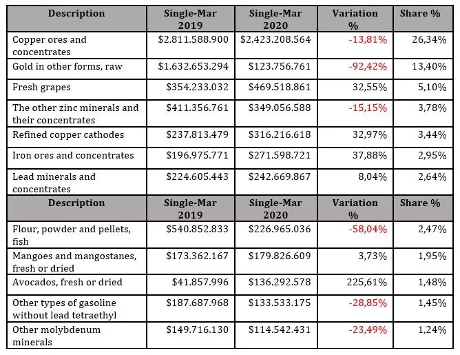 Table 2: Peruvian exports, main products, January to March 2019 and 2020. FOB value expressed in US$