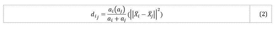 where and are the amplitudes of clusters and . and are the coordinates of the centers of mass of the clusters, || … || – Euclidean distance. As a result, a symmetric matrix is formed. Then two clusters are determined, the distance between them is minimal. These clusters are combined, and the new center of the resulting cluster is calculated: