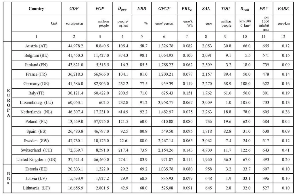 As an initial step in investigating the relationship between socio-economic indicators and HSR fare, a table was compiled highlighting the various demographic, geographic and economic factors of the European States currently operating HSRs and the Rail Baltica Member States (RBMS) – the objects of the study clustering.
