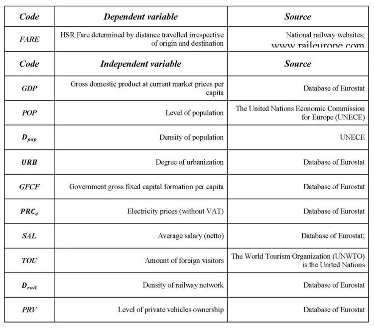 The choice of variables is explained by the intention to study the impact on HSR fare of the main social and economic indicators, as well as the observance of the comparability and unity of the conditions of the objects under consideration.
