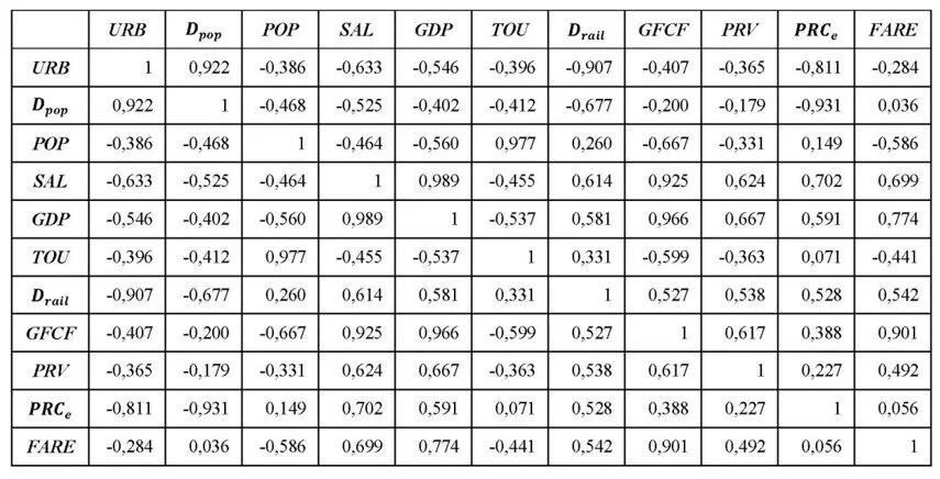 This study has made use of correlation analysis in order to determine the degree of influence of the variables selected by the author on the HSR fare within each of the clusters. For this, a matrix of paired correlation coefficients was used (Table 4).
