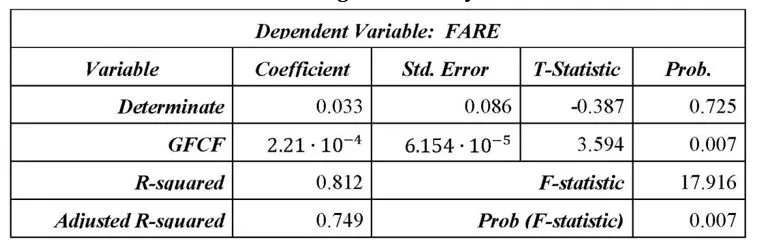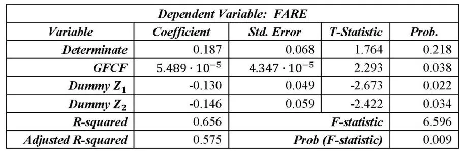 The first model is a regression reflecting the influence of the GFCF variable on the HSR fare in the first cluster, since in this case it is the reference one. After checking for multicollinearity between influencing factors in Cluster 1 (Tab. 5), the resulting regression equation can be expressed as follows: