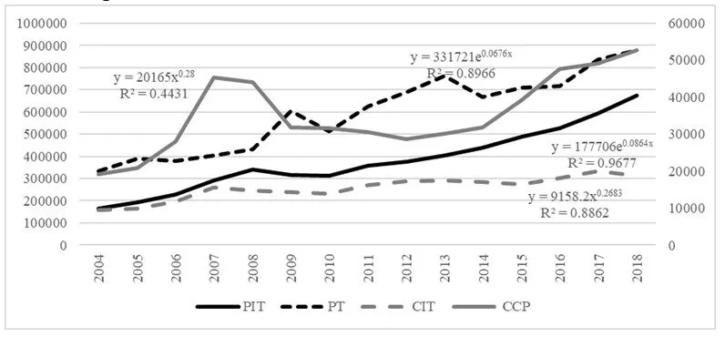 Average values of corporate income tax followed a power trend function, whereas trends of PIT and property tax followed the exponential function. These trends reveal a rising trend, with the dynamics being the biggest for PIT (ca.8,64% of average annual increase). Property tax grew by an average annual of 6,76%. However, the power trend must be interpreted with caution since if the time variable increases by 1%, the tax will grow by 0,27%. The tax on civil law transactions also shows a power function, but because of its discordant results, adjustment of 52% was applied.