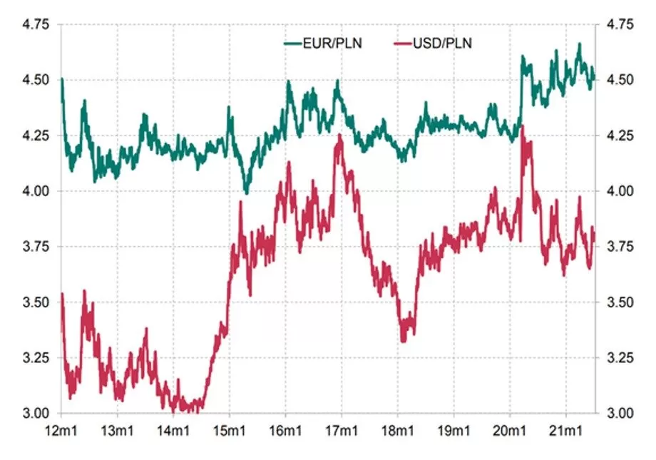 Fig. 2. Nominal exchange rate of the euro and the US dollar in zloty (January 2012 – May 2021)