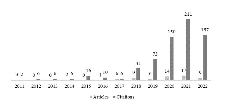 As already mentioned, 67 articles were selected. Figure 1 shows that the last 3 years were the most relevant, both in terms of published articles and in terms of the number of citations. It should be noted that, in 2022, only the first 5 months of the year were included in this analysis. However, the number of citations is already over one hundred and a half. The first publications are dated from 2011 (3 articles and 2 citations). Over the period under analysis, annual average growth rates of 10.5% and 48.7% were recorded in the number of published articles and in the number of citations, respectively.