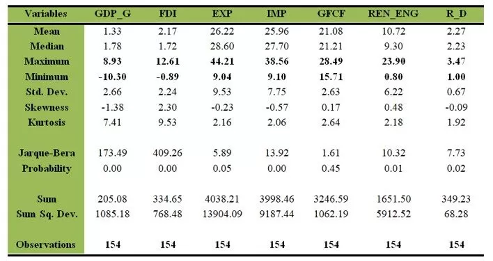 The methodology approach of this study is based on Panel EGLS (Cross-section random effects) regression, including in the analysis the economic growth as an endogenous variable, adding at different stages the following exogenous variables: foreign direct investment, exports, imports, gross fixed capital formation, renewable energy consumption and research and development expenditure.