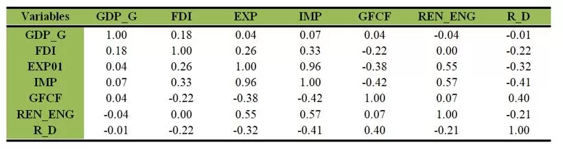 The correlation matrix was carried out to establish the intensity of the links between variables and how these could be associated in the same regression model. As we could see below in Table 3, no strong correlation was found between the variables, except for exports and imports, which were expected to be studied separately from each other. The correlation between economic growth and foreign direct investment is positive, in line with the base hypothesis from which we conduct this study. Also, there are positive correlations, but weaker than with the investment, with exports, imports and gross fixed capital formation. Closer to zero, but negative correlations of economic growth are with renewable energy consumption, and research and development expenditure.