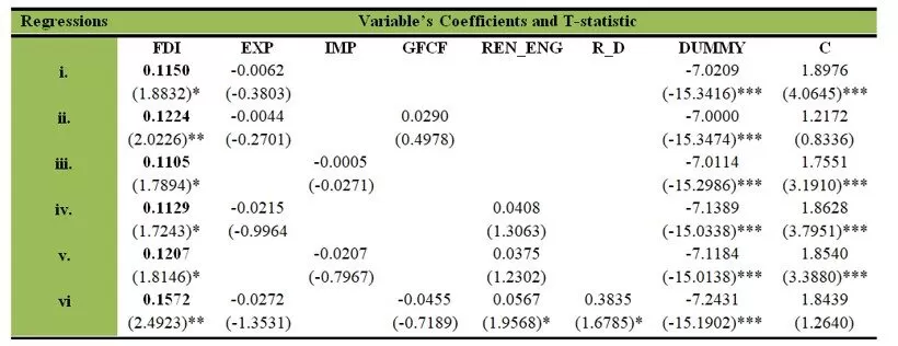 In Table 4, the coefficients of the explanatory variables are presented, together with the t-statistic value marked in the parentheses, in order to establish the significance threshold of each variable. The foreign direct investment variable is statistically significant at a 10% significance level in all the proposed regressions and even at a threshold of 5% in regressions ii and vi. Thus, the results showed that in the case of G7 contries an increase of FDI with 1pp could generate up to a 15.72% increase in economic growth. In line with the assumption of the paper, in the case of G7 countries, foreign direct investment is not just a source of capital, representing a main driver of technology transfer and innovation, efficiency, job opportunities, export growth, public revenues, economic stability and global integration. Moreover, in the regression vi, the renewable energy consumption and research and development expenditure are also statistically significant at a 10% significance level. An increase of REN_ENG with 1pp could generate 5.67% increase in economic growth, and an increase of R_D with 1pp could generate as well 38.35% increase in economic growth. In the last years, the renewable energy consumption was an important driver of green growth in G7 countries, based on sustainability, energy efficiency, less dependence on energy imports, green jobs, stimulating investment and innovation, attracting capital and reducing long-term energy costs. Regarding the impact of research and development expenditure on economic growth, G7 countries have done considerable investments in this direction. Japan became a world leader in technology, electronics, and robotics. The United States generated as well giant companies due to its sustained support for research and innovation. Dummy variable is statistically significant at a 1% significance level in all the regressions. The other variables as exports, imports and gross fixed capital formation are not statistically significant in our study.