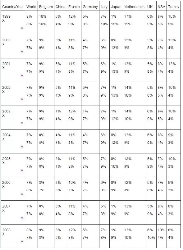 International trade continues to grow parallel to global output till 2007. However, merchandise production has declined due to the global crisis in 2008 although merchandise trade continued to grow. Agricultural output grew about 2.5% while agricultural exports rose more at rate of 4% between 2000 and 2008. The striking feature is that agricultural production and exports rise by 3% and 2.5% during the crisis year, 2008. Agricultural trade is growing higher than trade of fuels and mining products while the manufacturing is contacting in 2008. Leading exporters and importers of food in merchandise trade in the world are given in Table 1A and 2A in the Appendix. The top food exporters in the world are the USA, the Netherlands, France, Germany and Brazil. Turkey ranks 16th with 11 billion USD export in food. Turkey has a competitive advantage in food export despite its limited arable land compared to the major rivals. Its share in agricultural production could be an indicator of Turkey’s good performance in production despite the priority given to industrialization policies in the last three decades. The leaders of food imports in the world are the USA, Germany, Japan, the UK and the Netherlands. The top 16 food importers have a share of 63% in total imports. However, their share declined from 72% in the first half of the 1990s to 63% in 2008. A similar trend is observed for Turkey. Food imports rose significantly from 1 billion USD in 1985 to 9 billion USD in 2008. At the end of 2008, world agricultural imports made in the world, were approximately 1.1 billion USD. The share of agricultural exports in total merchandise exports for the major merchandise exporter countries and Turkey is presented in Table 3.