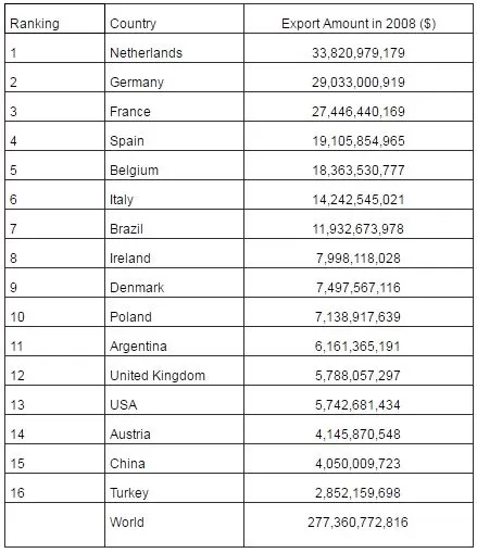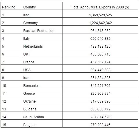 The major 15 food export markets of Turkey are Iraq, Germany, Russian Federation, Italy, the Netherlands, the UK, France, the USA, Iran, Romania, Greece, Ukraine, Bulgaria, Saudi Arabia and Belgium for the year 2008 according to the data retrieved from Exporters’ Assembly of Turkey (Table 4).