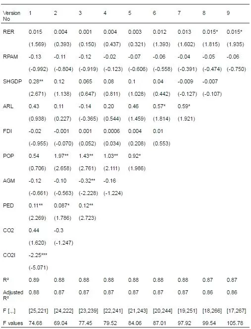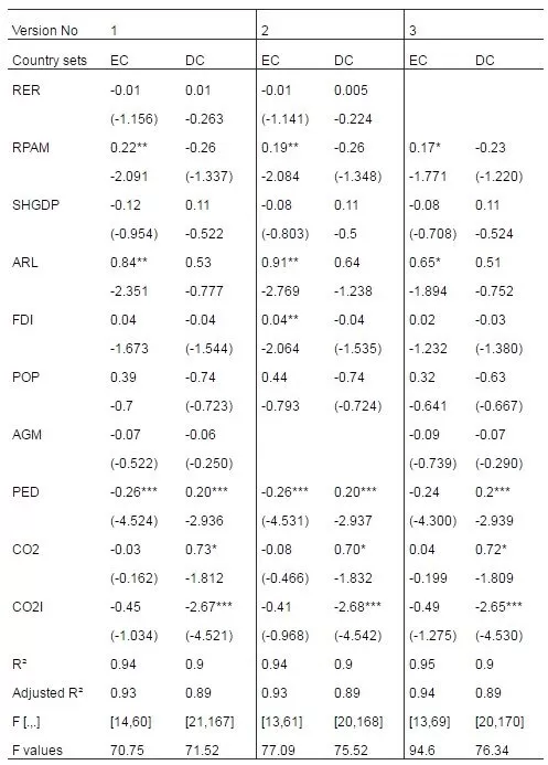 In the first versions of models all the variables have been included. In the second version of the models, one of the independent variables; AGM has been excluded since the expected sign of this variable mostly resulted in the opposite in the pooled version. Moreover, in the third version, RER is not included in the model. However, in all of the versions of the OLS model, results showed that this variable affects the dependent variable in a positive trend and is also significant in seven of the versions. The explanatory power of the FEM with all variables version 1 is around 0.90 for emerging countries and 0.68 for DCs, indicating that the independent variables are better capable of explaining the changes in agricultural trade capability for both emerging and DCs after disaggregation.