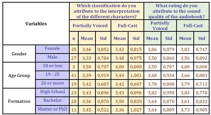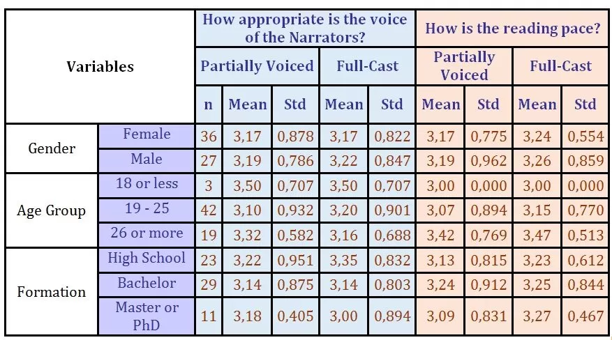 Table 2 presents the mean and standard deviation (Std) of the subject’s answers to the quality of the narrators’ voice and the reading pace, according to the gender, age and formation of the subjects.